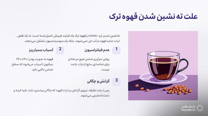 تهنشین شدن لِرد (telve) در قهوه ترک یک فرآیند فیزیکی کنترلشده است، نه یک نقص. اصل علمی پشت این پدیده این است که ذرات جامد قهوه در آب حل نمیشوند، بلکه یک سوسپانسیون تشکیل میدهند. سه عامل کلیدی در این فرآیند نقش دارند: